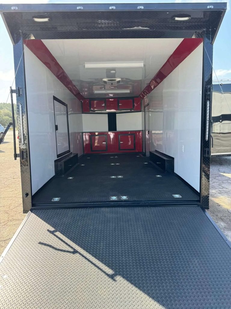 Discover the 5 by 20 Blackout Race Trailer for Sale, built with a powder-coated black shell, dual axles, and 7,000-pound torsion brakes. This compact yet rugged trailer fits most garages and tracks, with ramp-door access and secure tie-downs.